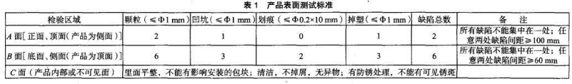 ⑦產(chǎn)品外表不能有成片的塑粉小顆粒、絲印油墨點(diǎn)、凹坑、凸塊和凸出的痕跡或流掛痕跡,也不允許渙散和少量顆粒存在。具體情況詳見(jiàn)表1.
