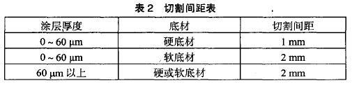 附著力測(cè)驗(yàn)運(yùn)用的劃線器,選用由碳鎢合金材料制成的標(biāo)準(zhǔn)百格刀;膠帶用3M 600號(hào),2 cm寬膠帶(在45。方向拉一次測(cè)驗(yàn)),附著力應(yīng)達(dá)到GB 9286規(guī)則的二級(jí)要求。具體情況如表2所示。